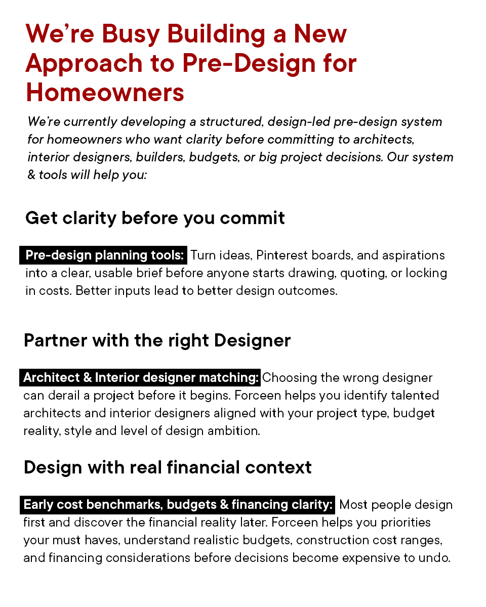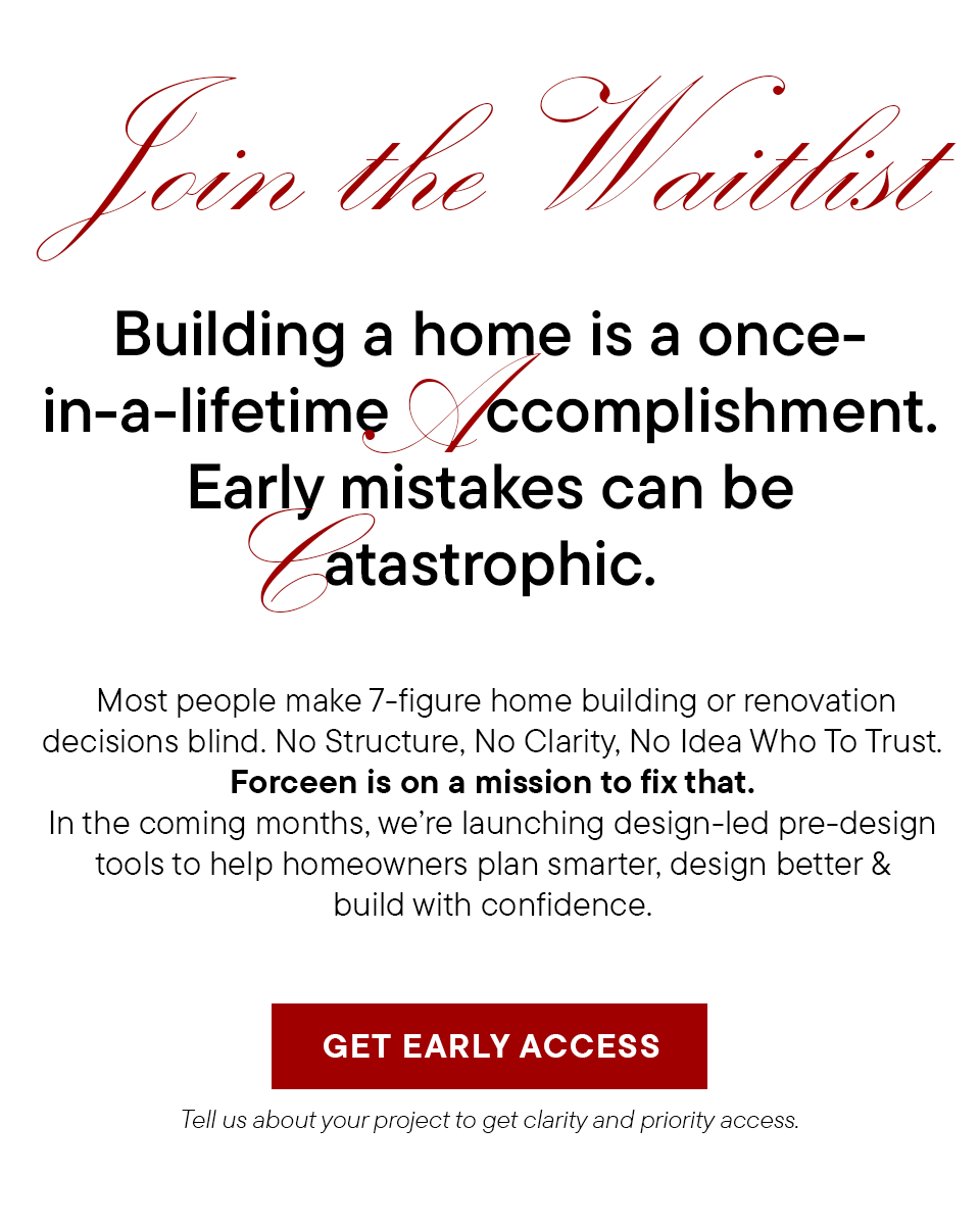 That experience sparked a mission: to create Forceen, a structured, design-first pre-design platform that helps homeowners plan smarter, avoid costly errors, and design & build beautiful homes with confidence.
